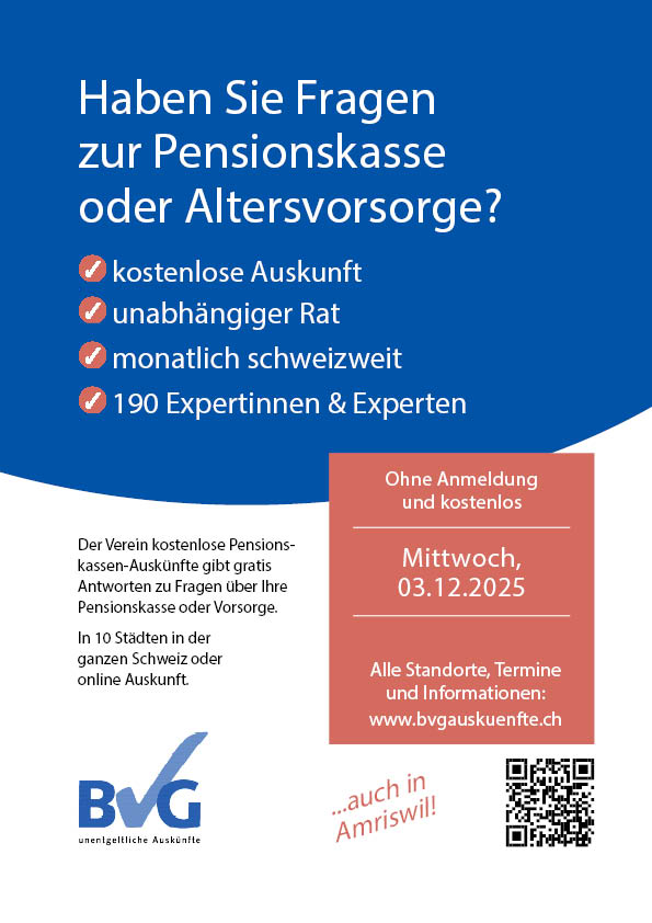 Haben Sie auch Fragen zum Thema Pensionskasse? Kommen Sie vorbei, eine Anmeldung ist nicht notwendig. Bringen Sie das Pensionskassenreglement und Ihren Vorsorgeausweis mit.